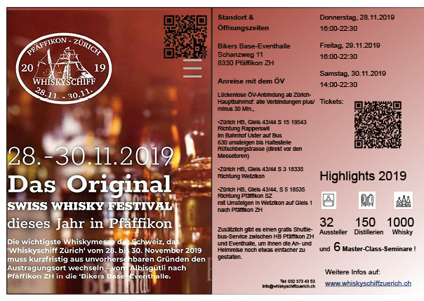 Infos unter Whiskyschiff Zürich (Achtung: Ausnahmsweise in Pfäffikon ZH).