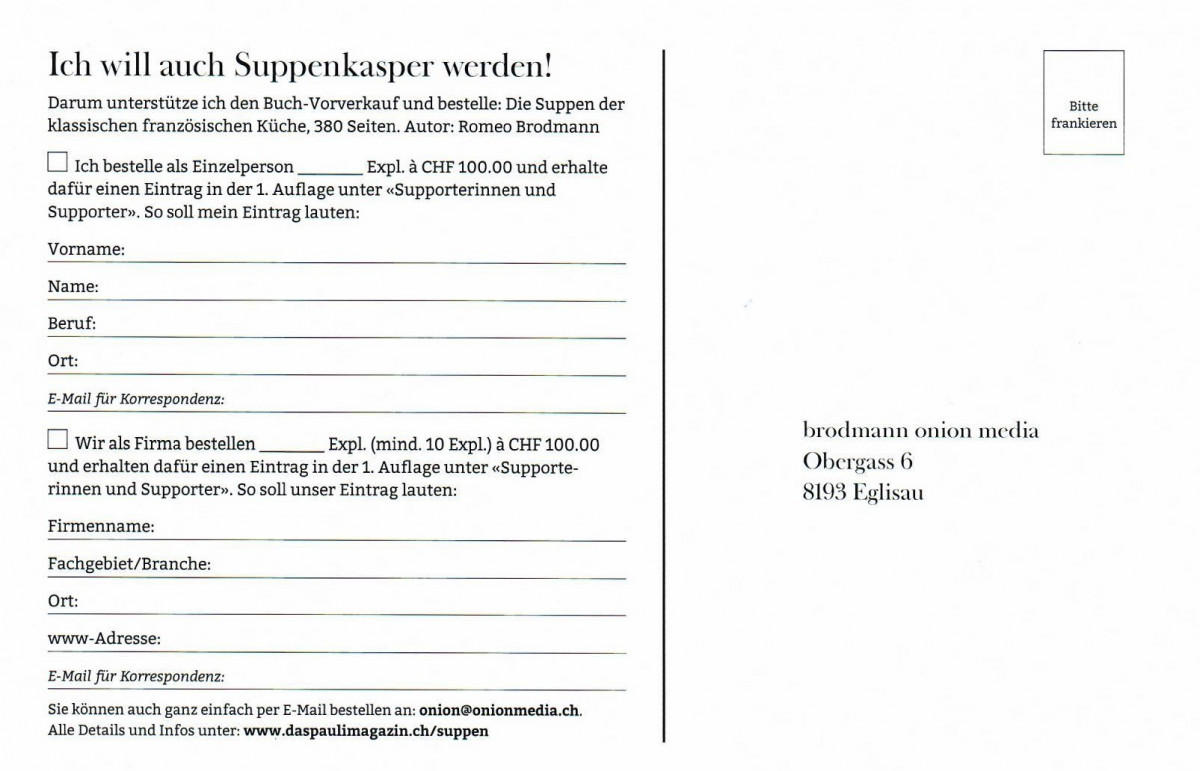 Dann unterstütze mit einer Soupscription den Buch-Vorverkauf "Die Suppen der französischen Küche" mit Rezepten aus aller Welt auf gegen 400 Seiten. Autor: Romeo Brodmann.